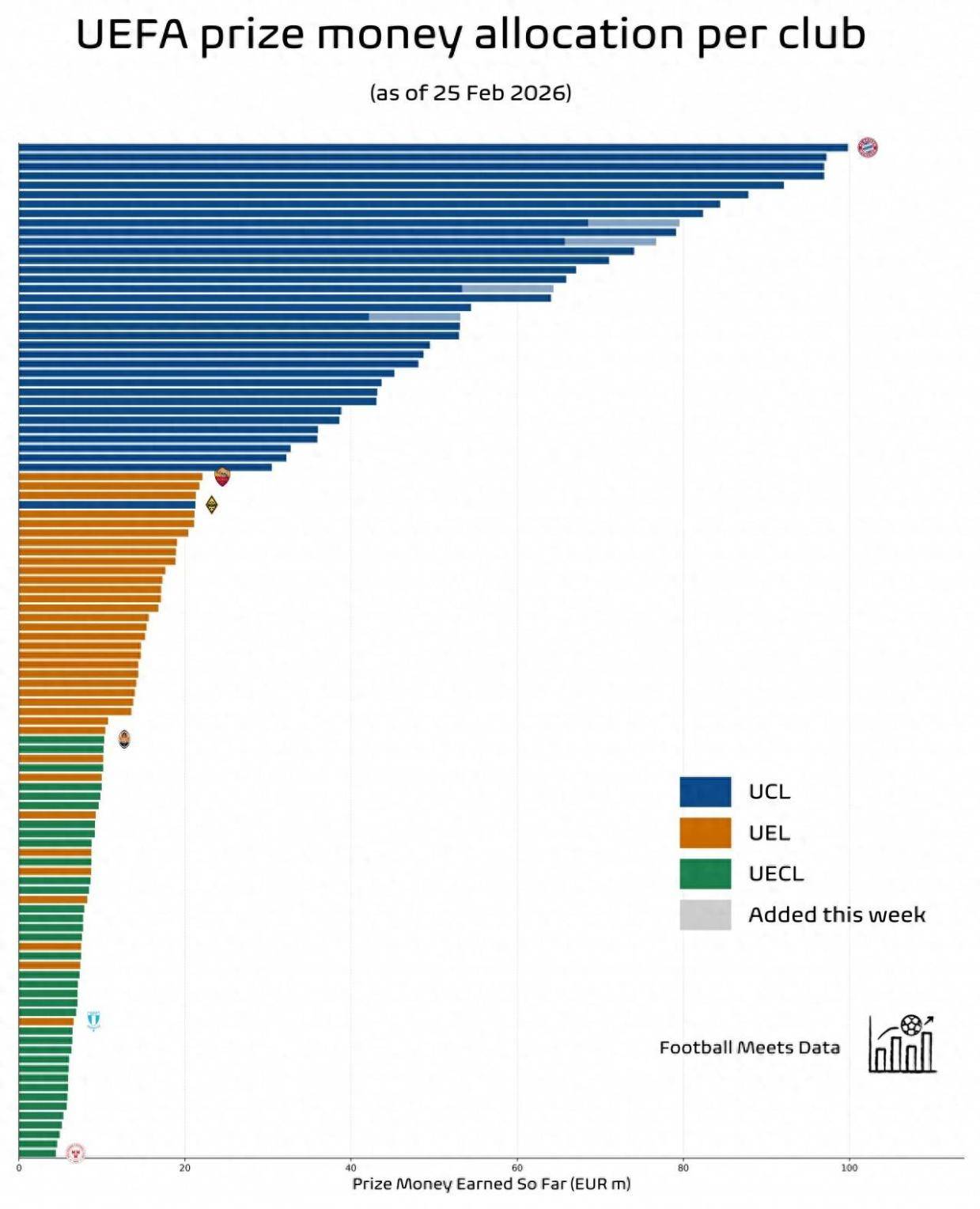 专业数据媒体Football Meets Data统计了目前三级欧战(欧冠、欧联杯、欧协联)的奖金情况: